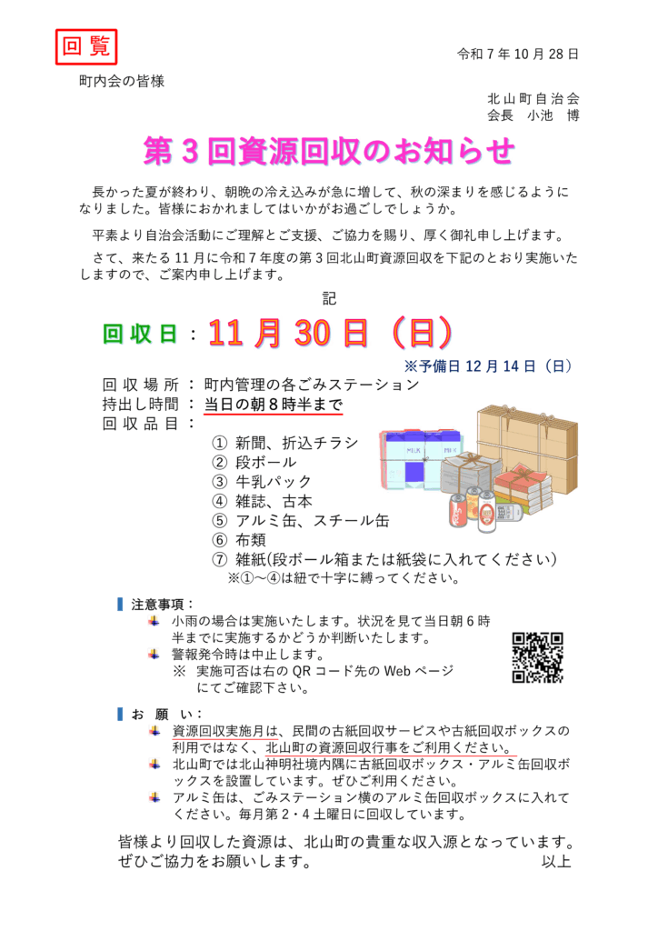 第3回資源回収を実施します 2025年10月31日 最終更新日時 : 2025年11月29日 kitayama-cna_webmaster 11/30(日) 令和7年度 第3回資源回収 予定通り実施します 資源持ち出し時間は当日午前8時半までです。 ※当日、資源回収に参加できない組長・委員長は、必ず自治会長 小池(090-8547-2680) までご連絡ください。